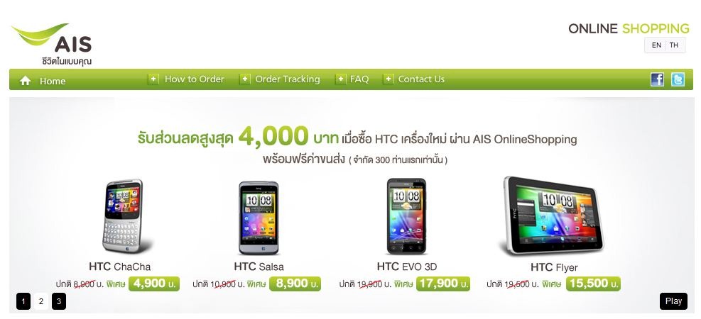 สำหรับลูกค้าที่สั่งซื้อสมาร์ทโฟน HTC เครื่องใหม่ผ่าน AIS OnlineShopping ในตอนนี้จะได้รับลดราคาพิเศษ 4 รุ่น สำหรับ 300 ท่านแรกเท่านั้น โดยรุ่นที่ลดราคาในครั้งนี้เหมือนกับโปรโมชันในครั้งก่อน ดังนี้