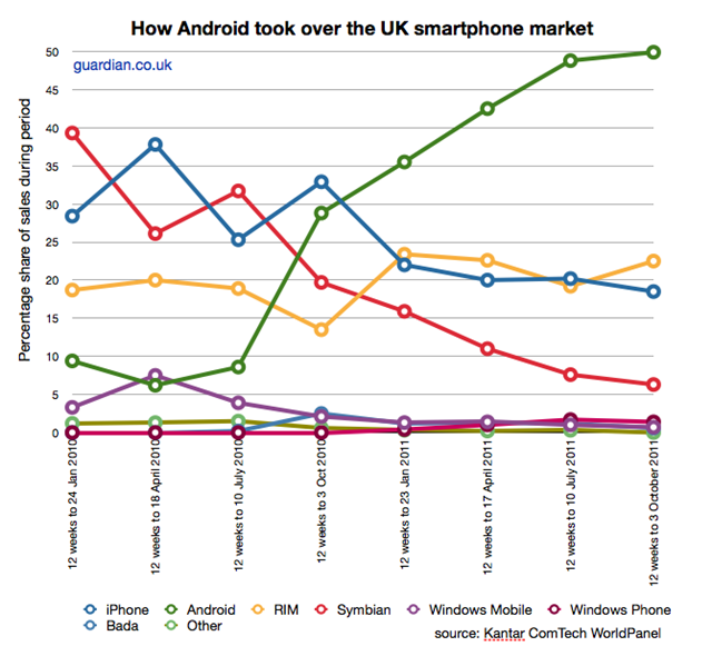 Charles Arthur นักเขียนจากหนังสือพิมพ์ guardian ได้เขียนบทความเเสดงถึงปัจจัยต่างๆ ที่ทำให้ Android ในประเทศอังกฤษเติบโตเหนือกว่าเเพลตฟอร์มโทรศัพท์มือถืออื่นๆ จนมีส่วนเเบ่งมากกว่า 50% ในผลการสำรวจเดือนตุลาคม