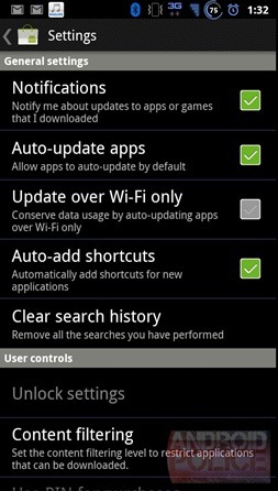วันนี้ Android Market ตัวใหม่ก็ได้ถูกปล่อยออกมาโดยมีการปรับปรุงอินเตอร์เฟซเล็กน้อย เเต่การเปลี่ยนเเปลงที่สำคัญที่สุดคือการเพิ่มฟีเจอร์ Auto-update apps ทำให้ไม่ต้องติ๊ก Auto Update ทีละเเอพอีกต่อไป Update over Wi-Fi Only, เเละ Auto-add shortcuts ใน Setting ของ Android Market