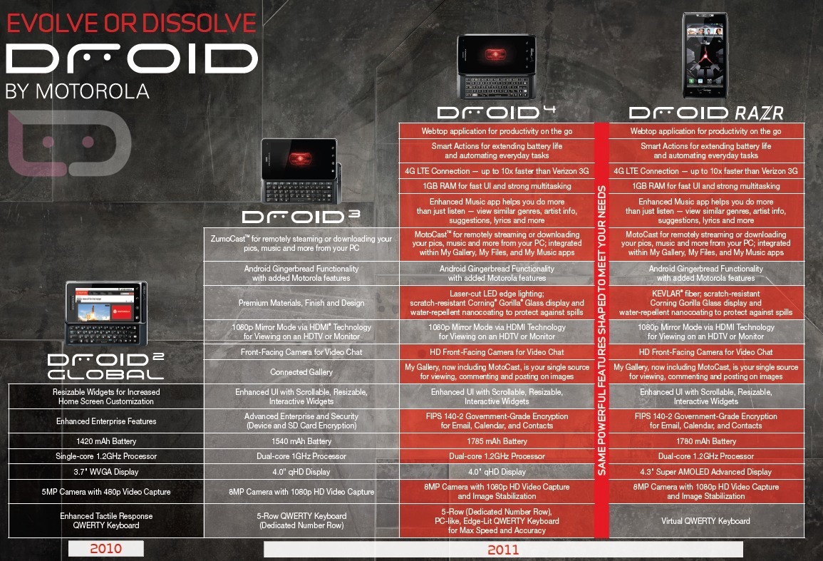 นอกจากนี้เเล้วยังมีตารางเปรียบเทียบระหว่าง Droid 2, Droid 3, Droid RAZR กับ Droid 4 จะเห็นว่า Droid 4 นั้นมีสเปคที่ใกล้เคียงกับ Droid RAZR มากเเต่เพียงไม่มี QWERTY Keyboard มาเท่านั้นให้นั่นเอง