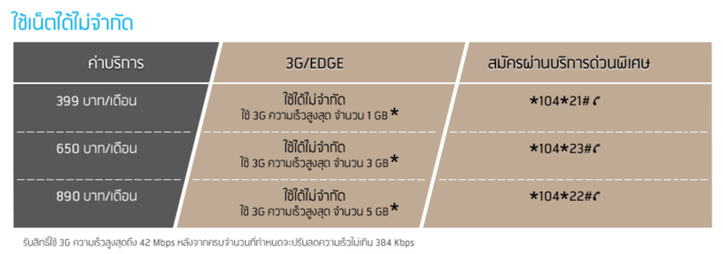เเพคเกจที่ว่าคือโปรอันลิมิต ที่เริ่มต้นต่ำสุดที่ราคา 399 ต่อเดือน โดยสามารถใช้ 3G/EDGE ได้ 1 GB เเละเมื่อเกินจากนั้นจะวิ่งที่ความเร็ว 384 Kbps ตามมาตรฐานทั่วไป ซึ่งก่อนหน้านี้มีเเพคเกจเเบบนี้อยู่ที่ราคา 699 บาท เเต่สามารถโทรฟรีได้ 350 นาทีสำหรับสมาร์ทโฟน