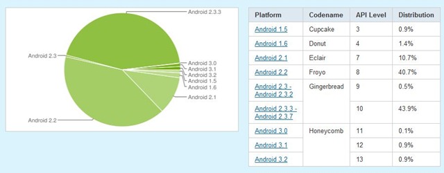 ภาพตารางที่เห็นเป็นข้อมูลล่าสุดเมื่อวันที่ 3 พฤศจิกายนที่ทาง Google ได้อัพเดทข้อมูลของสัดส่วนผู้ใช้แบ่งตามเวอร์ชั่น ผลคือ Gingerbread แซงหน้าแชมป์เก่าอย่าง Froyo ไปนิดหน่อยอยู่ที่ 44.4% เหนือกว่าอันดับสองที่ 40.7% สิริรวมแล้วตอนนี้แอพฯ ที่ดีควรรองรับอย่างน้อย Froyo เป็นต้นไป เพราะจะสามารถรองรับอุปกรณ์ได้มากกว่า 80% เลยทีเดียว