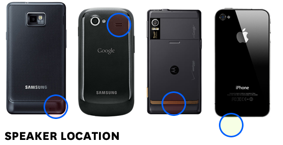จากภาพจะเห็นว่าทั้ง Galaxy S II, Nexus S หรือแม้แต่ Motorola Droid ต่างก็วางลำโพงไว้ในตำแหน่งที่มักจะถูกดลดทอนเสียง เวลาวางนาบกับพื้นทั้งสิ้น แต่ในขณะเดียวกัน iPhone เลือกที่จะวางตำแหน่งของลำโพงไว้ที่ด้านล่างของเครื่อง (จากรูปจะเห็นว่าเป็นด้านซ้าย แต่ถ้ามองจากด้านหน้าจะเป็นด้านขวา) และอีกฝั่งเป็นไมโครโฟนสำหรับสนทนา ผลคือเมื่อวาง iPhone ไว้นาบกับพื้น เสียงจากลำโพงจะไม่ถูกลดทอนเพราะว่าไม่ได้ถูกบังนั่นเอง และปกติก็คงไม่มีวางเครื่องเป็นแนวตั้งหรอกใช่ไหม ?