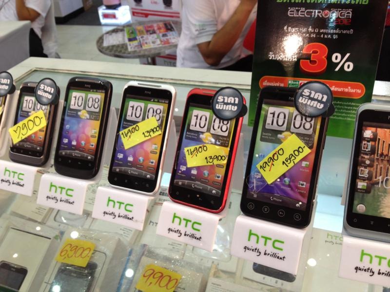 ตัวเเรกคือ HTC Sensation ที่ราคาปกติอยู่ที่ 17,200 บาทเหลือ 14,900 บาทเท่านั้น เเต่ในงาน Electronica นี้ ที่บูธของ HTC นั้นมีการลดราคาหลายรุ่นทีเดียว ซึ่งมีราคาดังนี้