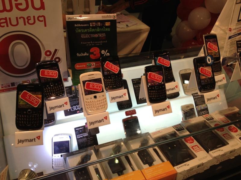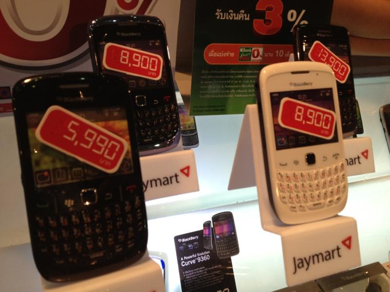 BlackBerry นั้นมาทุกรุ่นเเต่ไม่ได้ลดอะไรเป็นพิเศษเท่าไหร่ครับ ตัวล่างสุดอย่าง Curve 8520 ราคา นั้นยังมีขายอยู่ที่ราคา 5,990 บาท เเละตัวใหม่ล่าสุดอย่าง Bold 9790 ก็มาราคา 15,900 บาท เเละมี BlackBerry Torch 9800 มาขายเเบบลดราคาด้วย