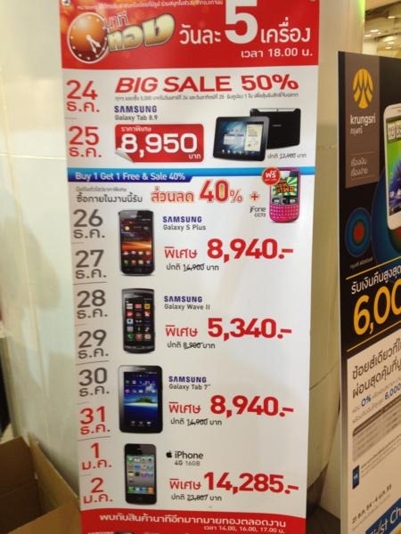 Samsung นั้นก็จัดมาขายทุกรุ่นเหมือนเดิม เเต่ว่ามีตัว Samsung Galaxy Tab 7 Plus มาขายเเล้วในราคา 15,900 บาท Samsung Galaxy Note ราคา 22,900 บาท เเละ Galaxy Y ในราคา 4,790 บาท