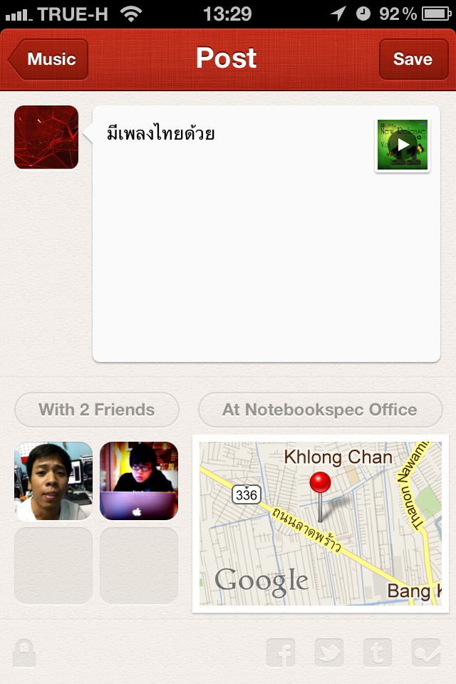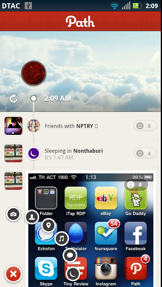 อาจจะดูซับซ้อนเเต่จริงๆ เเล้วการเเยกอัพเดทตรงนี้ค่อนข้างซ้ำ ที่จะใช้บ่อยๆ ก็เป็นรูปกล้องหรือรูปบอลลูนมากกว่า ส่วนคนหรือสถานที่สามารถเเท็กเพิ่มได้ภายหลังอยู่เเล้ว โดยรวมๆ เเล้วพอใช้ไปซักพัก มีความรู้สึกเหมือนเป็นไดอารี่เเบบหนึ่งเลยทีเดียว เเละมีไอคอนเล็กๆ มุมขวาเพื่อเลือก Social Network (Facebook, Twitter, Tumblr, Foursquare) ที่เราจะอัพสถานะไปพร้อมๆ กับ Path