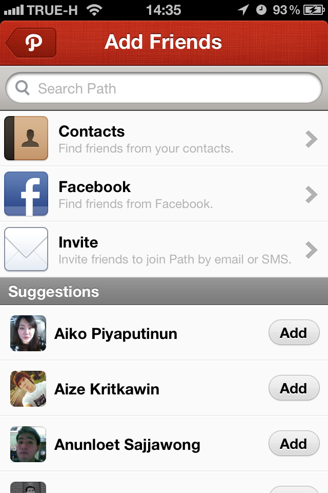การหาเพื่อนนั้นทำได้ไม่ยาก โดยสามารถหาจากเพื่อนๆ Facebook หรือ Contact ของเราได้ พร้อมทั้งเเนะนำคนให้เราเเอดเพิ่มไปได้ด้วย การใช้งานต่างๆ คล้ายๆ กับ Facebook คือหน้า Home ก็เหมือนกับ News Feed นั่นเอง ก็ส่วน Path ก็เหมือนกับหน้า Profile ส่วน Activity คือ Notification ดังนั้นใครคุ้นเคยกับการใช้ Facebook ก็ไม่น่ายากเท่าไหร่กับการใช้ Path