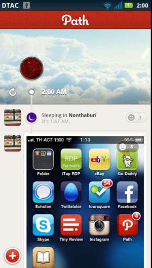 ไม่กี่วันนี้ก็มีเเอพตัวหนึ่งที่มีผู้ใช้งานเยอะขึ้นมาอย่างน่าสนใจ เเอพนั้นก็คือ Path นั่นเอง โดยลักษณะของตัวมันนั้นเหมือนเเอพ Social Network ทั่วไปอย่าง Facebook เเละ Twitter เเต่ความน่าสนใจของ Path นั้นอยู่ที่การออกเเบบเเอพลิเคชันที่ดูดี สวยงาม เเละยังรวมความสามารถในการโพสสถานะของตัวเองใน Path ไปยัง Facebook, Twitter, Foursquare หรือบล็อกอย่าง Tumblr ทำให้เราไม่ต้องเสียเวลามานั่งอัพเตตัสในหลายๆ ที่ นับว่าสะดวกกับการใช้งานมากทีเดียวสำหรับคนที่เล่น Social Network มาก