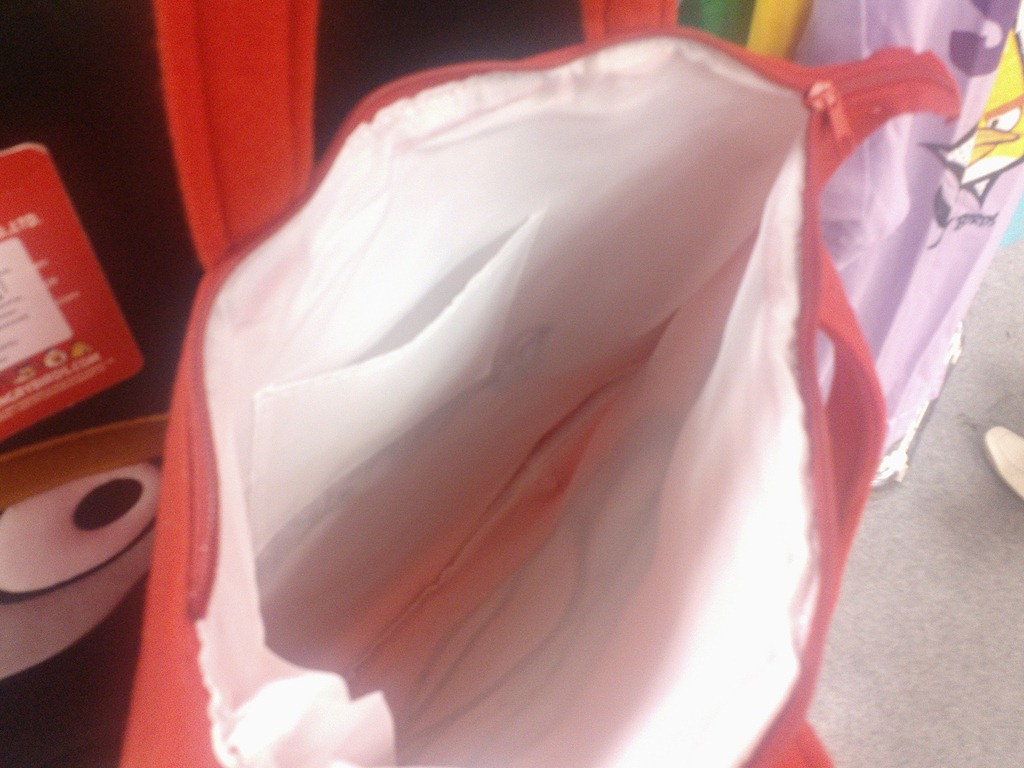 ต่อมาเป็นกระเป๋าสะพายข้าง (Tote Bag) ลาย Angry Birds มีสามลาย นกเเดง นกดำ เเละหมูเขียง ราคา 395 บาท ถือว่าไม่เเพง เเต่อย่าคิดเอามาใส่อะไรเยอะๆ เพราะถุงมันไม่ได้จุอะไรมากขนาดนั้น คุณภาพตามราคา เทียบกับคุณภาพงานเเล้วถือว่าไม่เเพง ด้านในมีซิปเก็บ 1 ช่อง